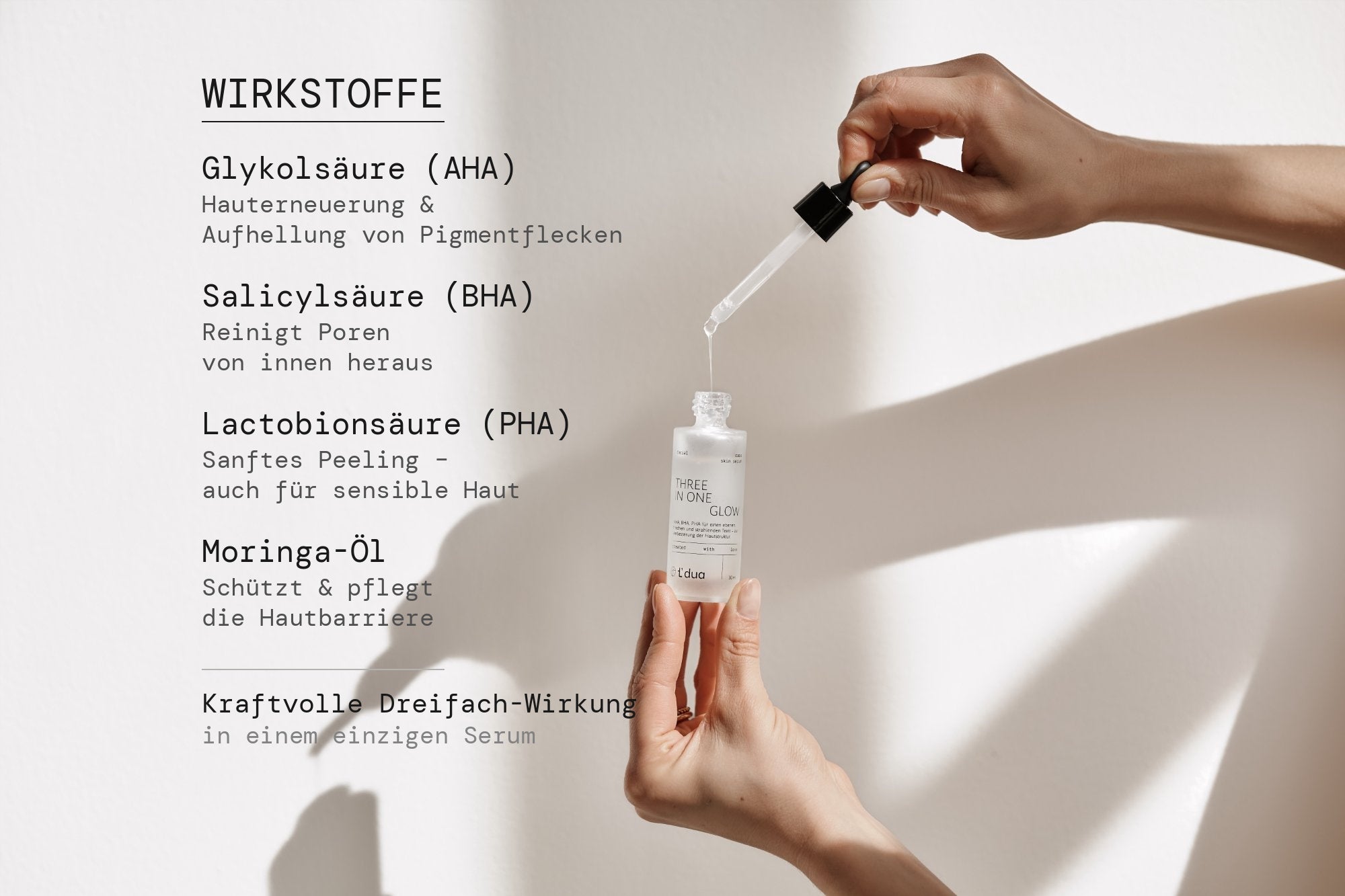 THREE IN ONE GLOW vereint AHA + BHA + PHA in einem zeitlich begrenzten Peeling-Serum: ca. 10% Glycolsäure (AHA) + 1% Salicylsäure (BHA) + 1% Lactobionsäure (PHA) – ergänzt durch weitere Fruchtsäuren. Für ein sichtbar glatteres, klareres und feinporiger wirkendes Hautbild – ohne Parfum.